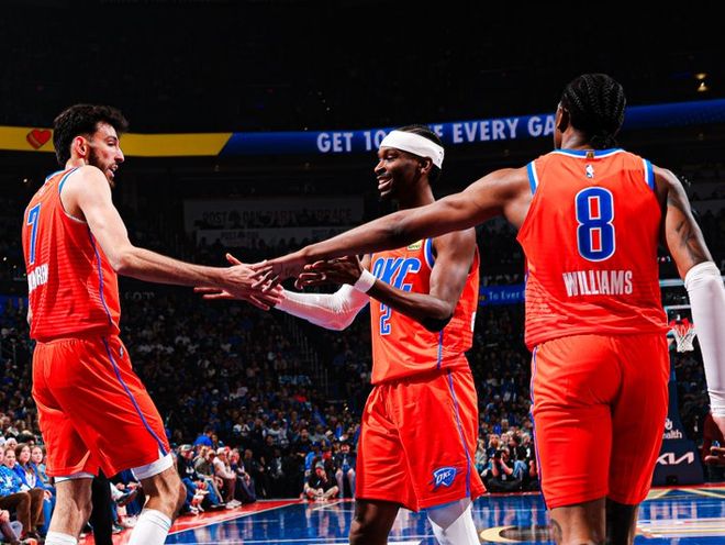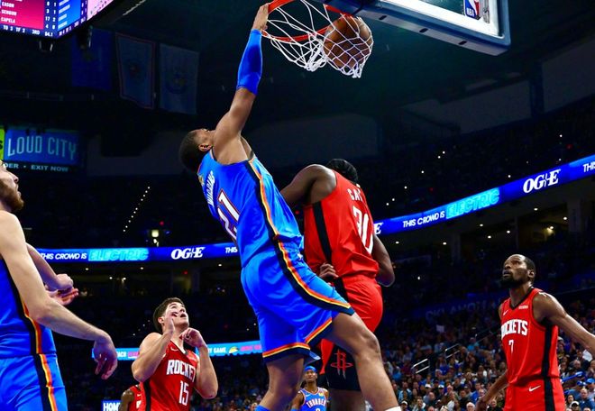 复出首战对阵太阳只有12中3,但此后很快找回状态,打勇士22分6助攻,打爵士25分8助攻,最近三场真实命中率也超过60%,他在场时球队百回合净效率值+19.5!这支雷霆,至少在常规赛层面,确实没有任何短板了,球队场均7人得分上双,防守联盟独一档,根本不给对手打阵地战的机会,场均利用失误能拿到24.6分联盟第一,自己控制失误联盟第二的水准,场均抢断联盟第二,快攻命中率联盟第一!按照美媒《BR》给出的预测,雷霆本赛季至少保底65胜,如果按照开赛以来的状态,最高可以冲刺到78胜!