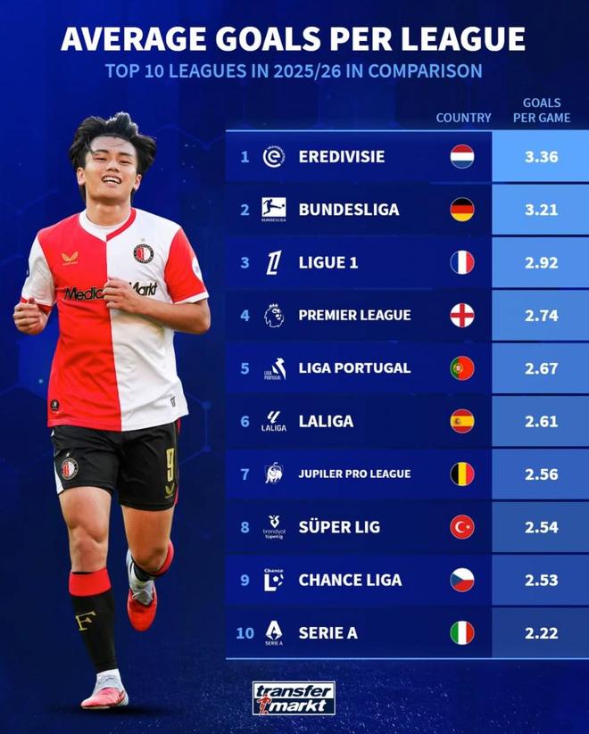 北京时间11月22日,德转列出了本赛季至今欧洲前10联赛的场均进球数排名,荷甲以场均3.36球高居第一,德甲3.21球领跑五大联赛,英超2.74球第四,西甲2.61球第六,意甲2.22球垫底。